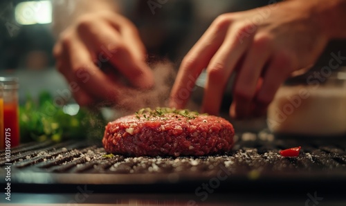 Chef is shaping meat to make hamburgers. Hamburger Preparation hands forming mince meat and seasoning a handcrafted burger patty, Generative AI