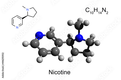 Chemical formula, skeletal formula, and 3D ball-and-stick model of nicotine, white background