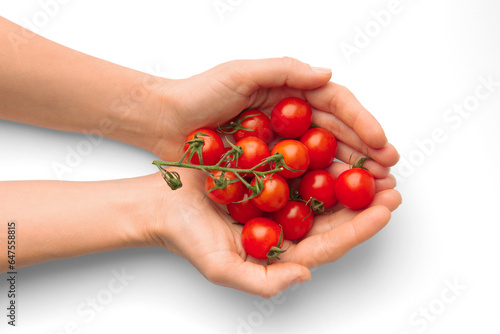 background, fresh, vegetarian, closeup, group, raw, ripe, ingredient, organic, cherry, vegetable, diet, healthy, tomatoes, hold, red, plant, isolated, hand, white, food, green, nourishment, freshness, small, tasty, macro, leaf, bright, tomatoes, cut, vegan, colours, garden, woman, harvest, vitamin, summer, natural, wooden, vegetable, topview, health, fruit, juicy, object, meal, agriculture, nature