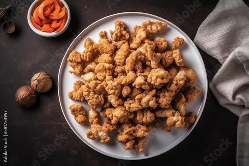 generative, ai, white, plate, top, view, colombian, food, cookery, deliciously, hearty, crisp, crispy, crunchy, tasty, appetising, salty, red, green, orange, yellow, delicious, savoury, full, favor, fried, pork meat, garlic, onion, cumin, oregano, cilantro, chili, aromatic, spicey, garnish, platter, traditional, meal