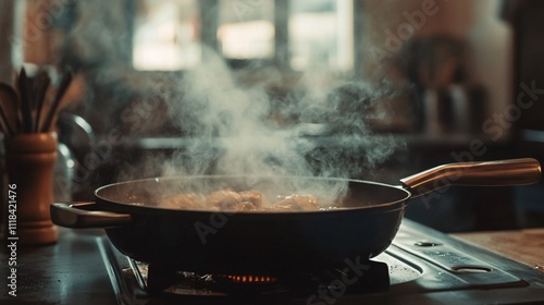Chicken cooking in pan on stove emitting steam in kitchen