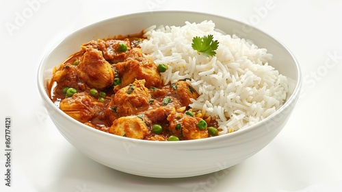 chicken, curry, rice, bowl, white, food, dish, indian, cookery, spicey, flavorful, savoury, delicious, appetising, fresh, homemade, healthy, meal, dinner, lunch, comfort, tasty, aromatic, green, pea, cilantro, closeup, photo, studio, background, isolated, bright, colourful, vibrant, simple, rustic