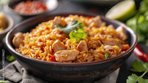 fried, rice, chicken, cilantro, bowl, garnish, red, orange, white, gold, food, dish, cookery, dinner, lunch, meal, tasty, delicious, appetising, savoury, healthy, alimentary, flavorful, spicey, comfort, asian, chinese, thai, japanese, korean, indian, vietnamese, oriental, culinary, gastronomy, dining, kitchen, eat