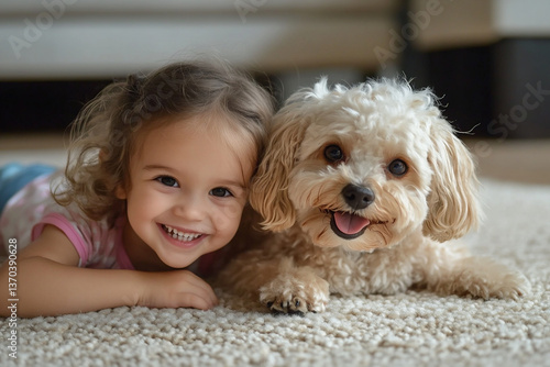 child and a Maltipoo playing on a carpet, both smiling and full of energy