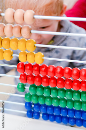Child learning to count. Young boy using an abacus to learn maths