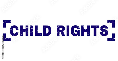 CHILD RIGHTS label seal print with distress texture. Text label is placed between corners. Blue vector rubber print of CHILD RIGHTS with retro texture.
