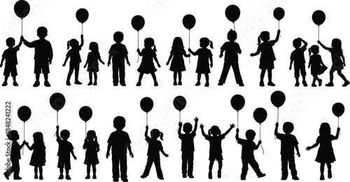 Children with balloons, playful silhouettes, festive scene, joyful posture, black vector art, celebration concept, outdoor activity, illustration, design element