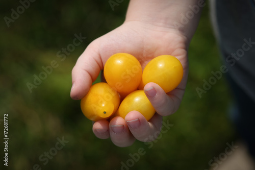 children, hand, yellow, heirloom, pear, tomatoes, grape, gardening, farming, organic, outdoors, outside, green, growing, garden, food, sustainable, fresh