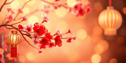 lantern, blossom, flower, cherry, red, gold, chinese, new, year, festival, celebration, spring, culture, tradition, asia, holiday, decoration, light, illumination, beauty, nature, floral, tree branch, background, design, art, image, graphic, picture, photo, aesthetic, elegant, festive, joyful, warm, happy, vibrant, delicate, bloom, oriental