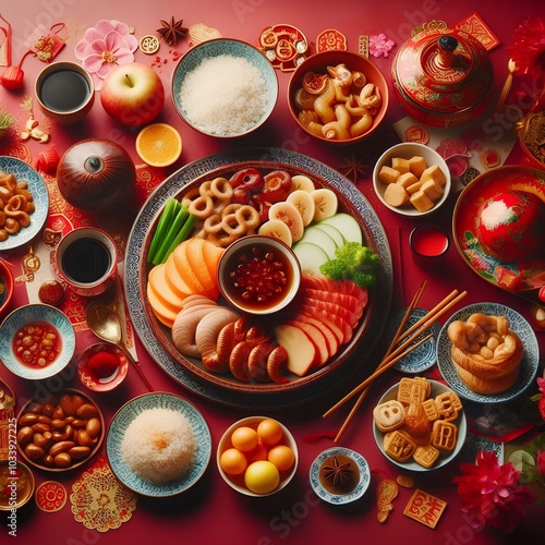Chinese new year festival table over red background. Traditional lunar new year food.