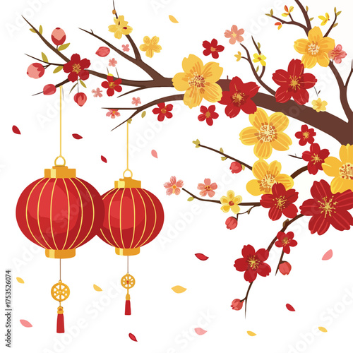 Chinese new year traditional watercolor illustration painting sumi-e with red paper lanterns and blooming tree in flowers