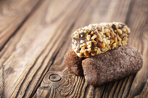 Chocolate cake on a wooden background. Three kinds of cakes.