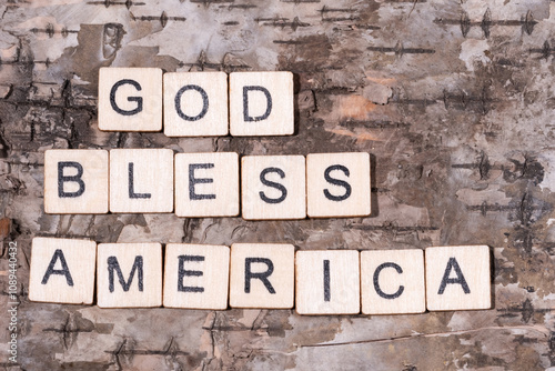Christian religious background concept. God Bless America written with wooden block letters on natural wood bark background