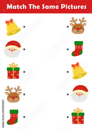 Christmas activity sheet. Find same picture worksheet for kids. Worksheet for kids kindergarten, preschool and school age. Education game for children with cute christmas illustration.