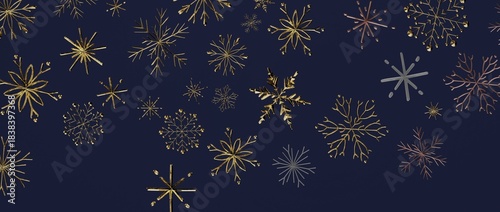 Christmas background featuring gold and rose gold snowflakes on a navy blue backdrop. Perfect for holiday desi