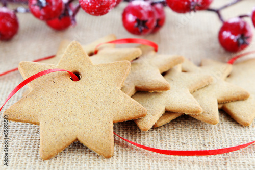 christmas, cookie, snowflake, gingerbread, christmas card, gift, christmas decoration, decoration, christmas gift, christmas ornament, ornament, star, sugar cookie, dessert, background, holiday, nobody, horizontal, red, ribbon