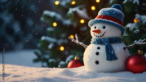 Christmas Day Christmas tree decorations gifts star ball color snowman background close up in a snow