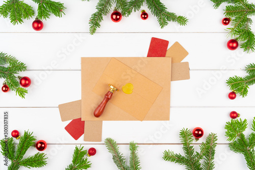 Christmas decorations on white wooden background with copy space