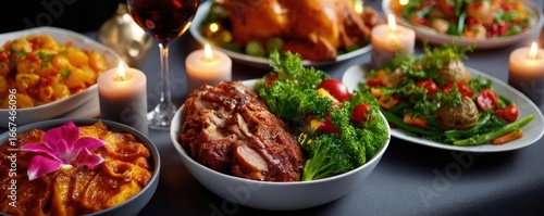 Christmas dinner table with festive dishes concept. A beautifully arranged feast with colorful dishes and candles.