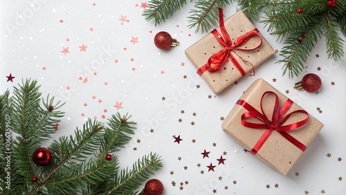 Christmas fir branches, gift boxes with red ribbon, red decoration, sparkles and confetti on white background. Xmas and New Year greeting card, winter holiday. Flat lay, top view