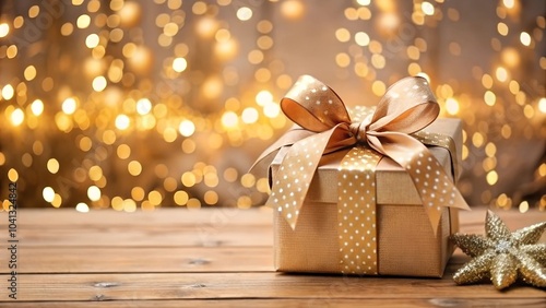 Christmas gift box with ribbon bow, festive gold decor on wooden table with glamour golden sparkling glitter bokeh. Merry Christmas and Happy New Year greeting card, seasonal winter holiday luxury set