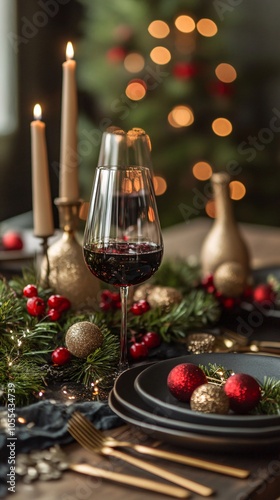 christmas, table setting, red wine, candle, holiday, celebration, dinner, winter, cosy, home, family, tradition, christmas tree, light, bokeh, warmth, elegant, decor, ornament, centrepiece, place setting, gold, red, green, dark, moody, christmas eve, new year, party