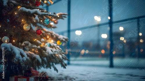 Christmas tree closeup with gifts on snowy tennis court, tennis net in background. Concept of resting basketball sport during Christmas time.