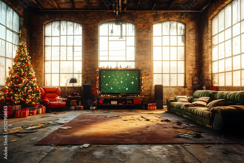 christmas, loft, festive, christmas tree, gift, present, sofa, couch, television, snowflake, winter, industrial, rustic, decay, urban decay, interior design, home decor, living room, holiday season, celebration, ornament, natural light, grunge, vintage, retro, unconventional, gritty, atmosphere, mood, setting, scene, digital artwork, illustration, background, hi-res, realistic, detail, empty space