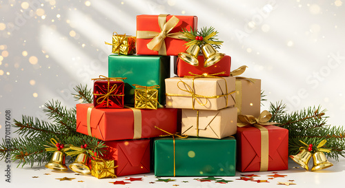 christmas, holiday, festive, winter, celebration, background, decorated, tree, gift, present, box, garland, ornament, light, ribbon, merry, eve, happy, new, year, gift, box, spruce, fir, pine, traditional, family, home, indoor, cosy, magic, magical, red, green, gold, white, snow, snowy, bokeh, sparkle, glistering, bright, glowing, colourful, season, seasonal, card, greeting, copy