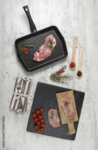 food, meat, table, tomatoes, ingredient, spice, dish, slate, composition, preparation, tool, kitchen, alimentation, group, rosemary, wellness, gridiron, napkin, table, kitchen table, breadboard, hob, broil, background