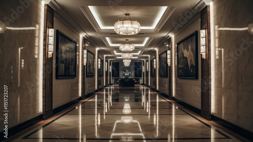 cinematic shot of elegant hallway with luxurious lighting and artwork. polished floor reflects chandeliers, creating sophisticated atmosphere