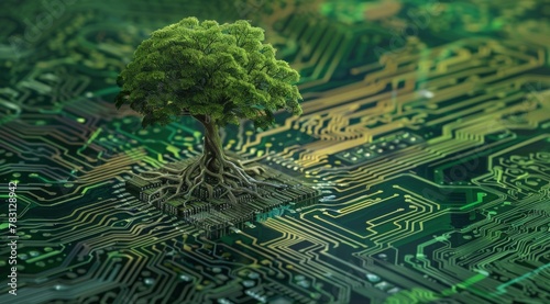 Circuit board with tree and digital elements, technology and sustainability concept.