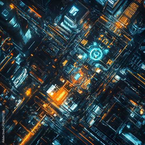 City of Technology: An enthralling, top-down perspective of a futuristic cityscape. The image captures an urban landscape.