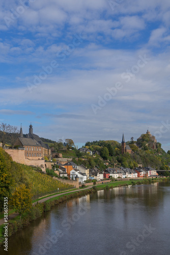 travel, german, europa, saar, town, village, river, castle, old, mediaeval, wine, water, hill, church, house, city landscape, romantic, city, landscape, autumn, colourful, vinery, history, saarland, european, small town, scenic, picturesque, green, cloudy, cloud, sky, fall, sunny