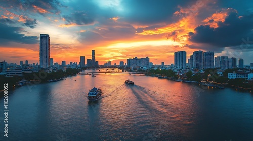 city, sunset, river, boat, building, skyscraper, urban, landscape, twilight, evening, water, travel, skyline, modern, architecture, golden hour, view, panorama, scenery, beautiful
