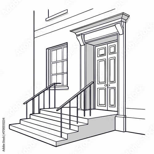 entrance, door, step, stair, balustrade, window, architecture, building, house, home, facades, exterior, classic, traditional, elegant, ornate, drawing, illustration, line art, vignetting, black-and-white, monochrome, outline, vector, design, entranceway, property, residential, old-fashioned, vintage, minimalist