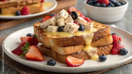 Classic Chicken And Cheese Breakfast French Toast With Fresh Berries, A Savory-Sweet Morning Treat Blending Crispy Chicken, Melted Cheese, Juicy Berries, And Golden Toast Delight