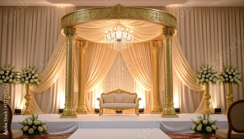 Classic Malay wedding stage with golden pillars and silk curtains