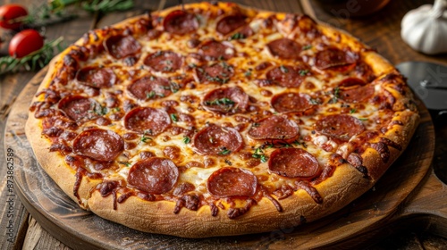Classic Pepperoni Pizza: A classic pepperoni pizza with perfectly placed slices, a bubbly crust, and slightly crisped edges, served on a wooden board with a pizza cutter next to it.