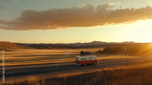 van, highway, sunset, landscape, mountain, field, adventure, travel, road trip, nature, scenery, vehicle, sky, golden hour, freedom, wanderlust, retro, summer, exploration, rustic, tranquil, picturesque, countryside, journey, distant, wanderer, peaceful, open space, tour tourism, scenic route, horizon, dusk, relaxing, camping, road, driving