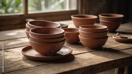 Clay bowls arranged on rustic wooden table with natural light