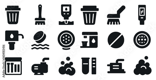 cleaning, solid, maintenance, flat, outline, vector, icon, set, sanitation, washing, housekeeping, hygiene, mop, broom, vacuum, scrub, disinfect, cleansing, tidy, cleanliness, utility, chore