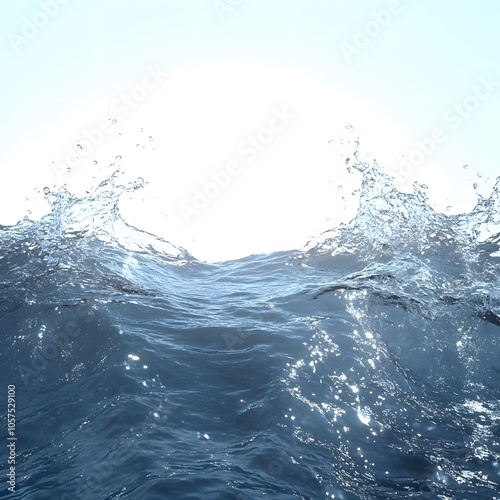 clear blue ocean wave water splashing, simple, 3D, daylight, white background, isolated, from below
