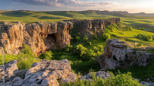 Cliff overhang above a green valley with shadow play and textured rock formations