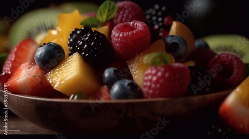 salad, fruit, berry, sliced, mix, bowl, healthy, vitamin, kiwi, raspberry, blueberry, blackberry, strawberry, mint, yellow, red, green, rip, freshly, diet, portion, tasty, dessert, ai, generated, dark, background, macro