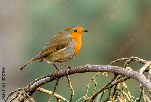 Close up of a beautiful robin redbreast perched on a branch with natural green background