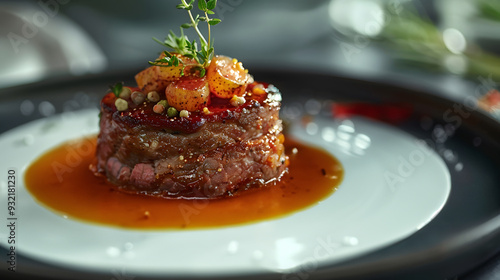 steak, beef, epicure, fine dining, culinary arts, food, meal, dinner, eatery, cookery, kitchen, cook, chef, dining, plate, white, brown, sauce, onion, thyme, garnish, closeup, delicious, tasty, savoury, meat, protein, accessing, table setting, cutlery, glasses, culinary, camera, lens, generative, ai