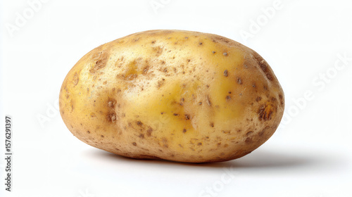 Close up of a single potato, presented against a clean, white backdrop.