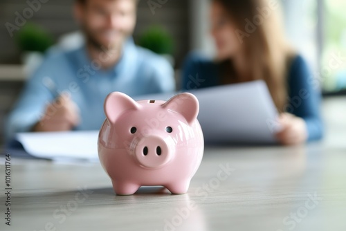 Close up of a small piggy bank on a wooden table, with a blurry couple in the background, doing financial paperwork, managing a household budget or planning an investment.