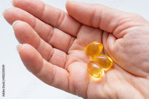 Close up of a woman's open palm holding three yellow capsules of the Omega-3 fatty acid dietary supplement. Concept of taking additional vitamins and minerals during menopause in women.